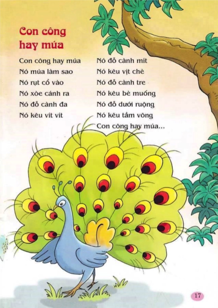 Đồng dao Con công hay múa: Con công hay múa, Nó múa làm sao, Nó rụt cổ vào, Nó xòe cánh ra, Nó đỗ cành đa, Nó kêu ríu rít, Nó đỗ cành mít, Nó kêu vịt chè, Nó đỗ cành tre, Kêu bè rau muống, Nó đỗ dưới ruộng, Nó kêu tầm vông.