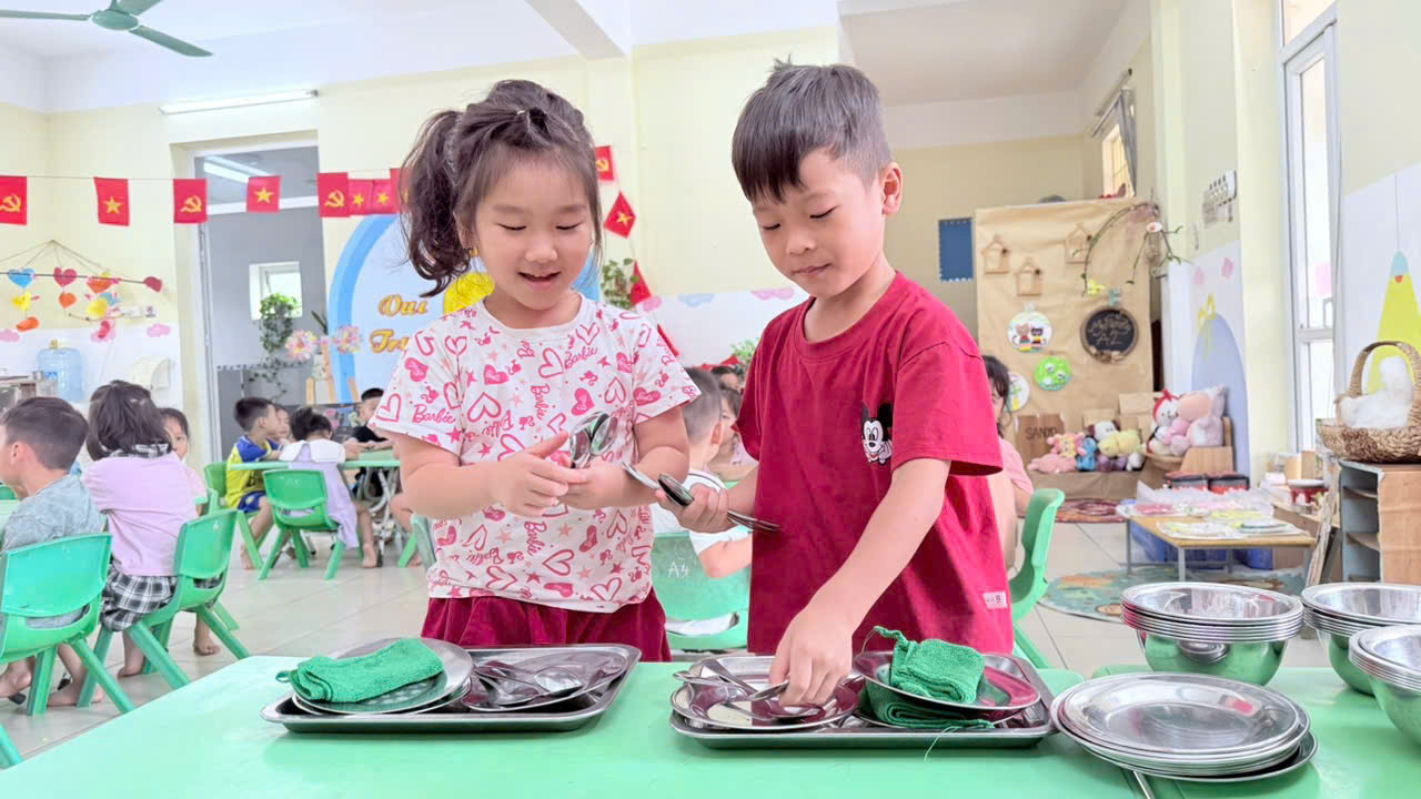 Trong mỗi bữa trưa, các bé lớp A2 được rèn kỹ năng tự phục vụ: trẻ trực nhật chuẩn bị bàn ăn, chia thìa, chia bát; các bạn ngồi ngay ngắn, tự xúc ăn và biết nhường nhịn, chia sẻ với nhau. Cô giáo nhẹ nhàng khích lệ để bữa ăn luôn tràn ngập tiếng cười.