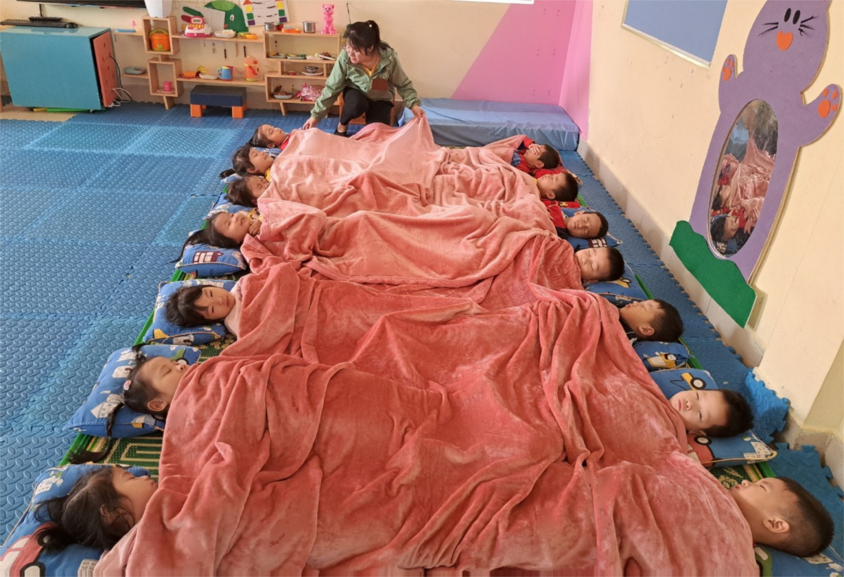 Sau một buổi sáng với rất nhiều hoạt động được tham gia tiêu tốn khá nhiều năng lượng của trẻ thì khoảng thời gian ngủ trưa chính là thời điểm lý tưởng nhất để đem đến cho trẻ tinh thần sảng khoái để tiếp thêm nguồn năng lượng cho các hoạt động buổi chiều. Để có được một giấc ngủ ngon cho trẻ thì giáo viên phải chuẩn bị các hoạt động giúp các con dễ đi vào giấc ngủ: sắp xếp phòng ngủ gọn gàng, sạch sẽ, thoáng mát về mùa hè, ấm áp về mùa đông. Trời nóng luôn có quạt, điều hòa giúp các con cảm thấy dễ chịu, có một giấc ngủ ngon. Trời lạnh có rèm che kín gió, chăn ấm đưa các con vào giấc ngủ sâu. Bên cạnh đó, trước giờ ngủ mỗi ngày, các cô luôn đưa ra các hình thức khác nhau để đưa trẻ vào giấc ngủ. Thông qua giờ ngủ trưa, trẻ được củng cố thêm một số kỹ năng lao động tự phục vụ và giáo dục giới tính.