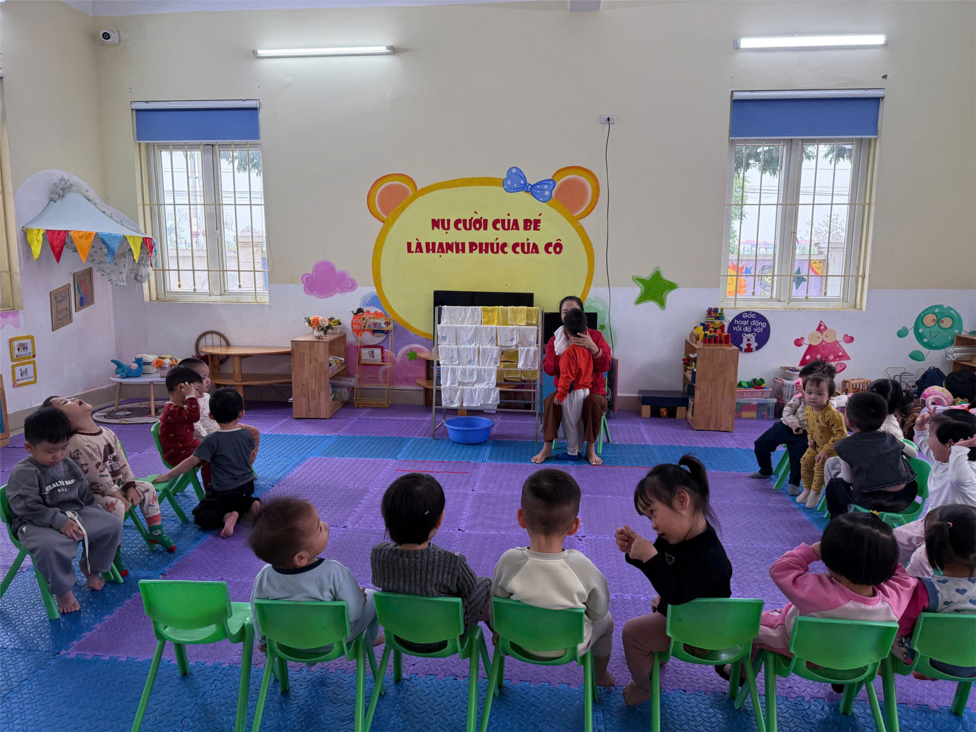 Giờ lau mặt là một hoạt động quen thuộc và rất ý nghĩa trong sinh hoạt hằng ngày của các bé lớp Nhà trẻ D2. Sau khi vui chơi và tham gia các hoạt động, các bé được cô hướng dẫn rửa tay, lau mặt thật sạch sẽ bằng khăn riêng của mình. Dưới sự hướng dẫn nhẹ nhàng của cô giáo, các bé học cách tự chăm sóc bản thân, biết giữ gìn vệ sinh cá nhân và hình thành những thói quen tốt ngay từ nhỏ. Không chỉ giúp các bé cảm thấy sạch sẽ, dễ chịu hơn, giờ lau mặt còn mang đến những khoảnh khắc vui vẻ, ấm áp trong lớp học, giúp các bé thêm yêu trường, yêu lớp và gần gũi với cô giáo, bạn bè