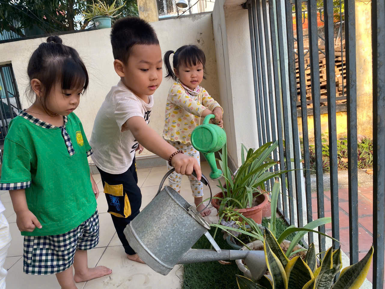 Thông qua các hoạt động thực hành, khám phá khoa học, kỹ năng sống như tưới cây, nhổ cỏ, nhặt lá khô… , trẻ hình thành tình yêu đối với môi trường sống và ý thức bảo vệ thiên nhiên xung quanh.