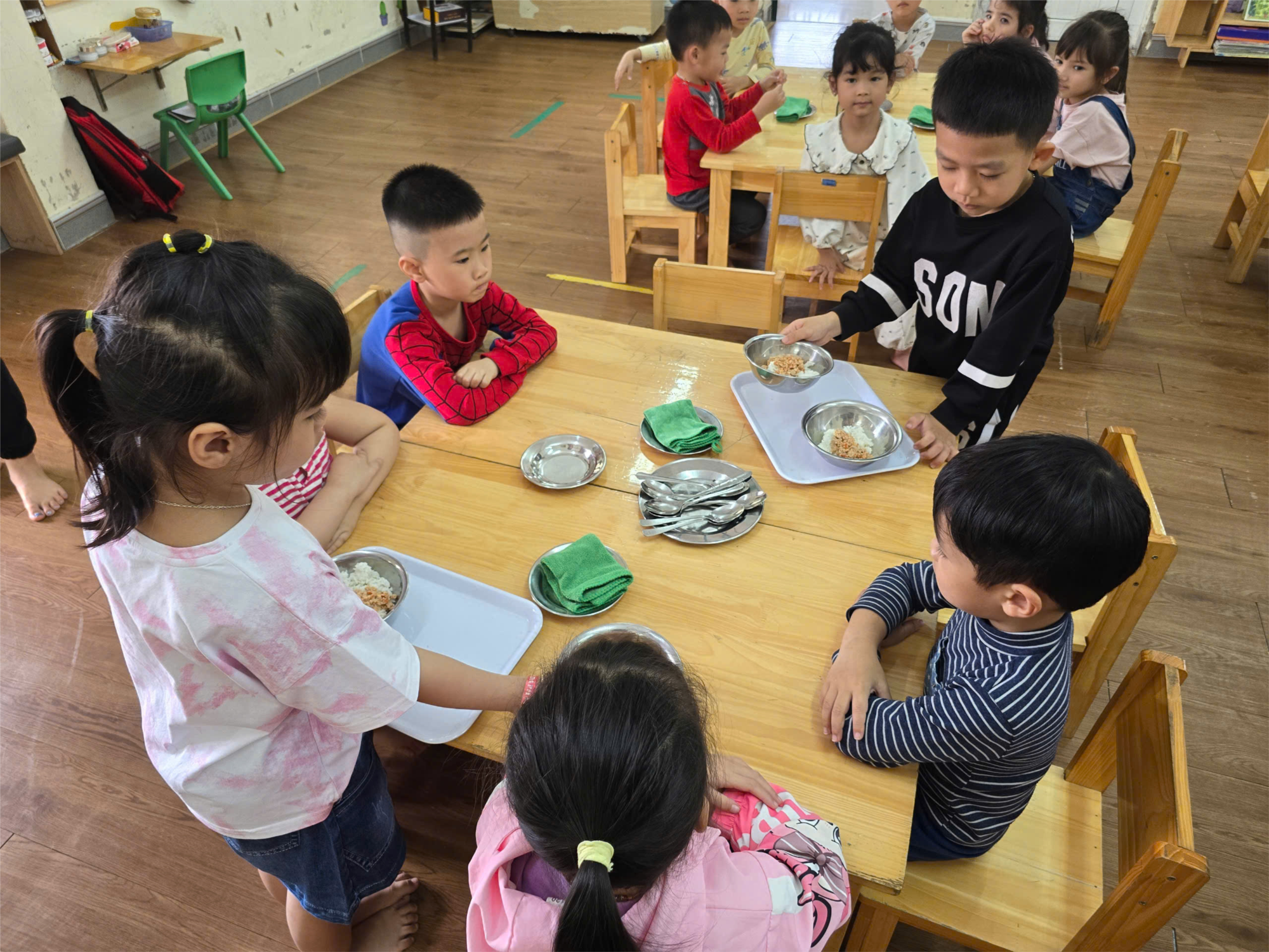 Trước khi ăn, trẻ được rửa tay sạch sẽ và ngồi vào bàn theo nhóm. Trong suốt bữa ăn, trẻ ngoan, có nề nếp, trẻ ăn từ tốn, tự xúc ăn và không làm rơi vãi thức ăn.