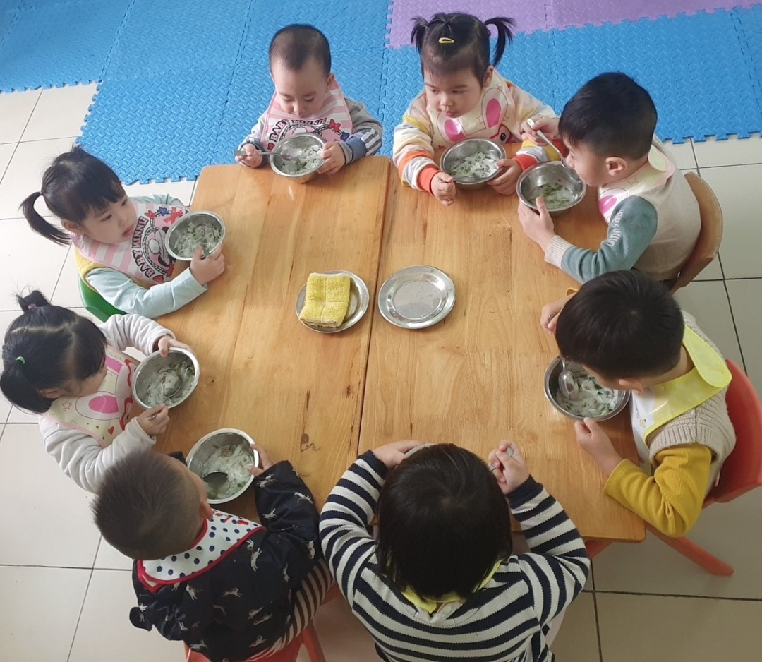 Hàng ngày các bé lớp nhà trẻ D2 trường mầm non B Ngũ Hiệp đến trường không những được học tập, vui chơi mà các bé còn được các cô giáo chăm sóc chu đáo từng bữa ăn giấc ngủ. Đặc biệt bữa ăn của các bé luôn được các cô quan tâm, động viên bé ăn nhanh, ăn hết xuất và biết giữ vệ sinh trong khi ăn. Qua giờ ăn góp phần giáo dục trẻ: biết rửa tay, lau mặt trước khi ăn; mời cô mời bạn trước khi ăn; trong khi ăn không cười đùa...