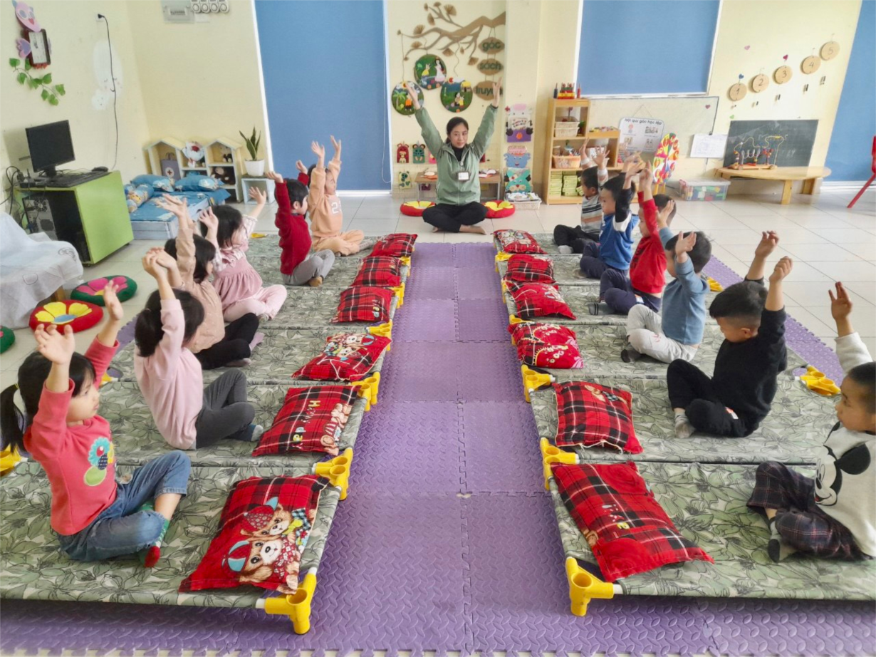 Cô và trẻ tập vận động nhẹ sau khi ngủ dậy