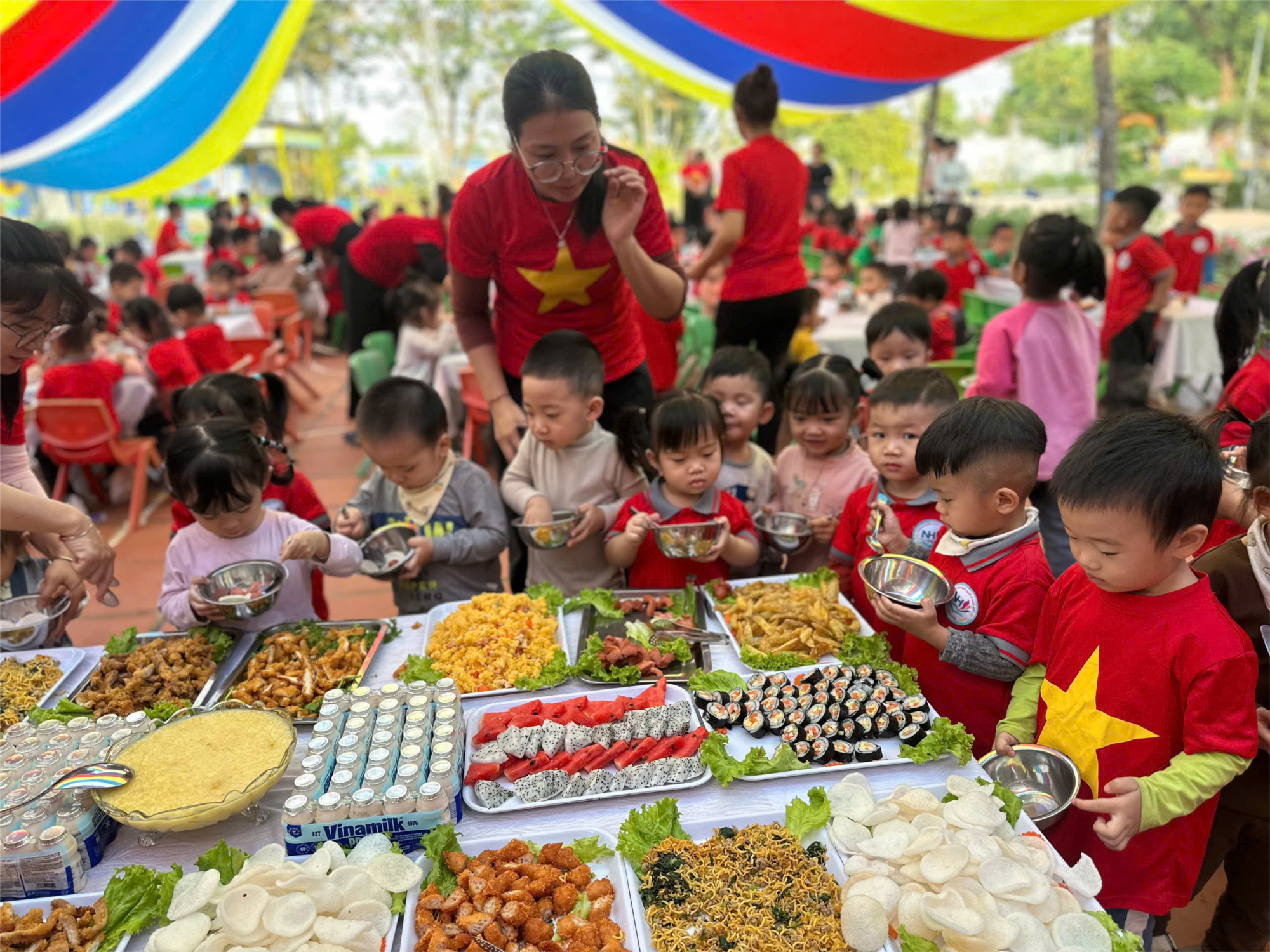 Trước khi bắt đầu tiệc, cô giáo đã hướng dẫn các con cách xếp hàng, chọn món, cầm thìa – cốc và biết mời cô, mời bạn trước khi ăn. Các bé rất thích thú khi được tự tay lựa chọn những món ăn yêu thích như trái cây, bánh ngọt, sữa, yaourt… Không khí bữa tiệc diễn ra nhẹ nhàng, vui tươi và tràn ngập tiếng cười.