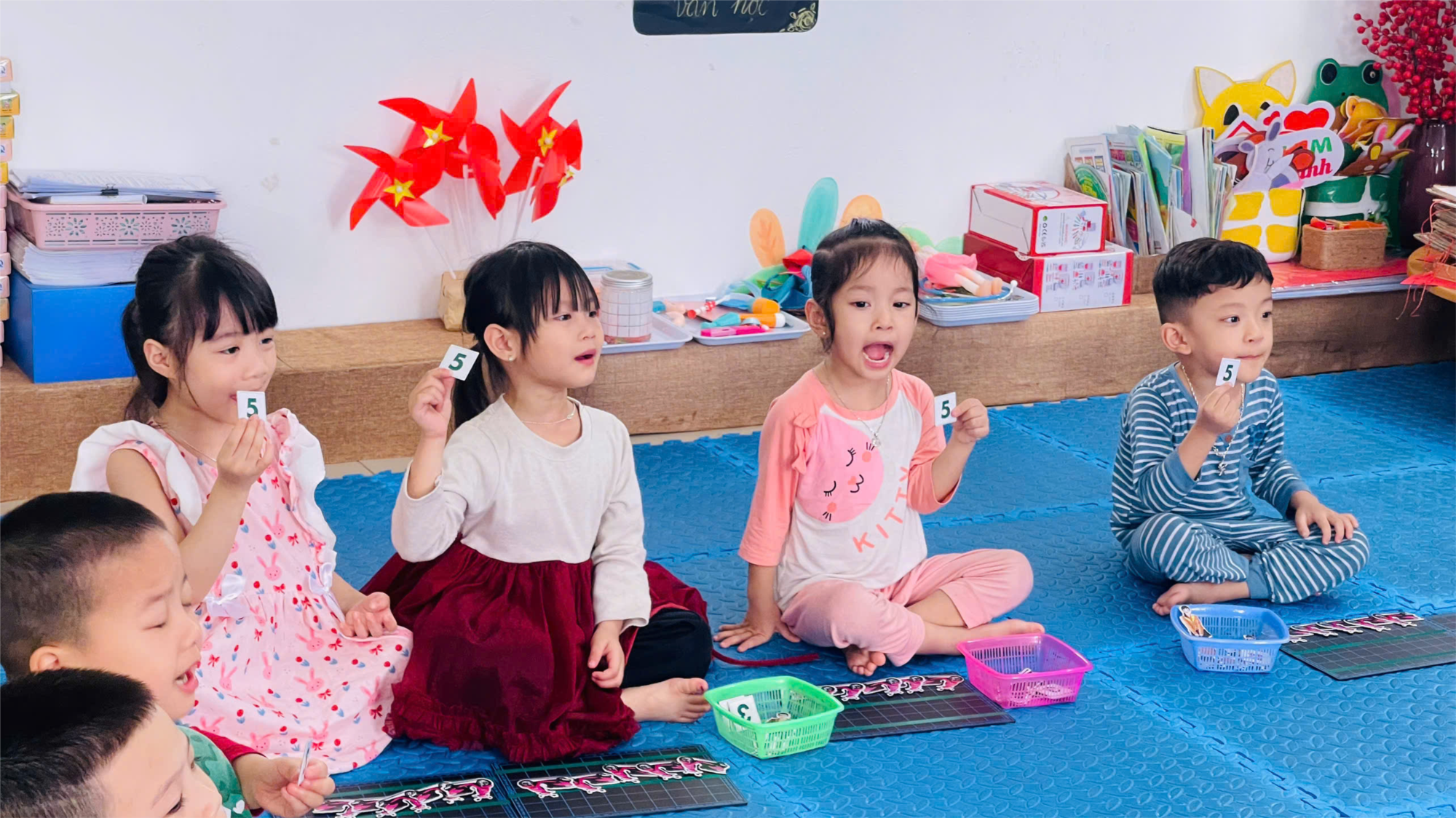 🌈Dưới sự dẫn dắt của cô giáo, các con cùng nhau nhận biết mặt số, tập đếm số lượng đồ vật và tham gia các trò chơi tương tác vô cùng sôi nổi. Những đôi bàn tay nhỏ xíu nhanh nhẹn lựa chọn thẻ số tương ứng với nhóm đồ dùng, giúp các con bước đầu hình thành tư duy toán học cơ bản. Giờ học không chỉ rèn luyện khả năng quan sát mà còn khơi dậy niềm yêu thích khám phá các con số qua từng hoạt động vui nhộn.