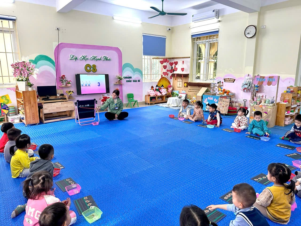 Các bé rất hào hứng, biết chia nhóm và gộp lại để đếm đúng số lượng.
