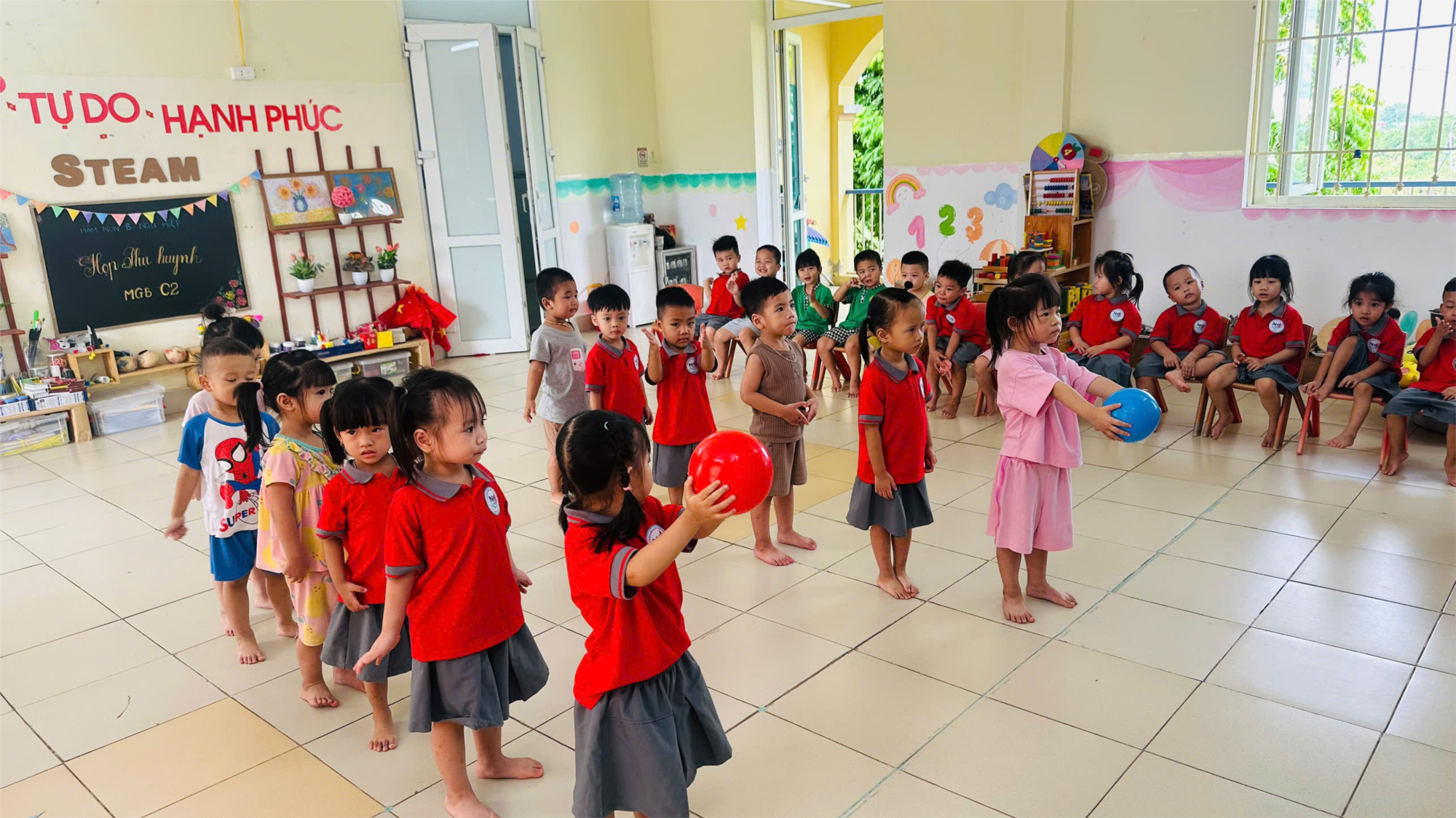 Giờ thể dục giúp trẻ rèn luyện sức khỏe, phát triển các nhóm cơ, xương khớp, tăng cường sự dẻo dai và sức bền. Đồng thời, thông qua những bài tập vận động, trẻ hình thành các kỹ năng cơ bản như đi, chạy, nhảy, ném, bật… tạo tiền đề cho sự phát triển thể lực lâu dài.Và đây là một số hình ảnh Trong chương trình chăm sóc – giáo dục mầm non, giờ thể dục là một hoạt động không thể thiếu, góp phần quan trọng vào sự phát triển toàn diện của trẻ. Đây không chỉ là khoảng thời gian rèn luyện thể chất mà còn là lúc trẻ được vui chơi, vận động và thể hiện sự hứng thú, năng động của mình.