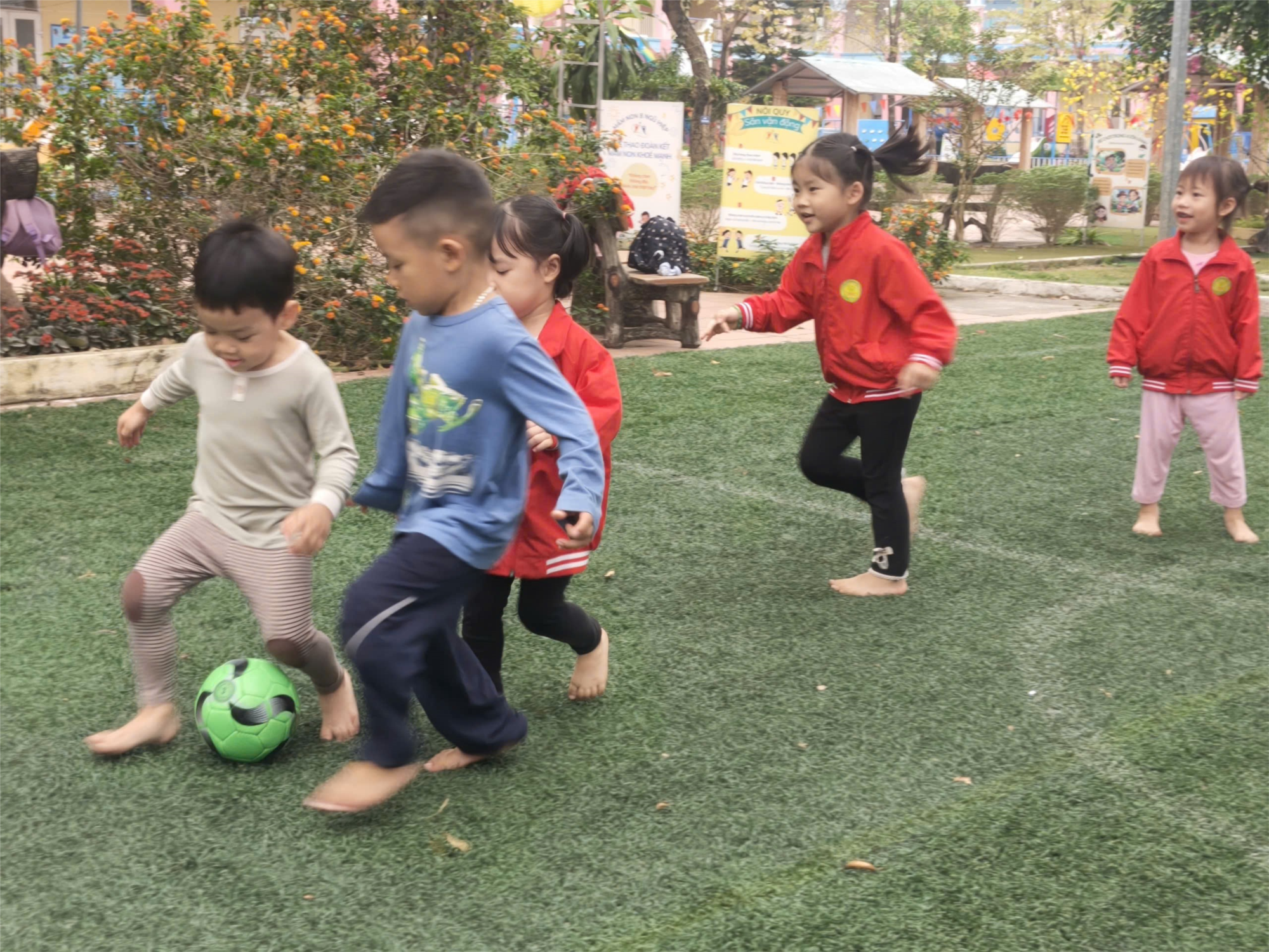 Trong giờ chơi, các bé được chia thành từng nhóm nhỏ, cùng nhau tham gia đá bóng dưới sự hướng dẫn của cô giáo. Không khí sân chơi trở nên sôi động với những tiếng cười vui vẻ, sự hào hứng và tinh thần thi đua của trẻ. Bên cạnh đó, hoạt động còn giúp trẻ học cách hợp tác, chia sẻ và tuân thủ luật chơi.