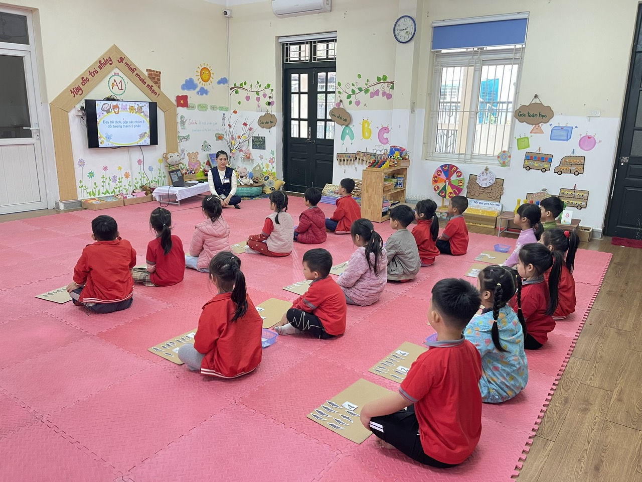 Tại lớp Mẫu giáo lớn A1 trường Mầm non B Ngũ Hiệp, tiết học làm quen với Toán luôn rộn ràng và đầy ắp những điều thú vị. Dưới sự dẫn dắt khéo léo của cô giáo, các bạn nhỏ hào hứng khám phá thế giới của những con số, hình khối qua các trò chơi vận động và giáo cụ trực quan sinh động. Những đôi tay nhỏ nhắn nhanh nhẹn phân loại, so sánh và đếm số lượng, giúp các con phát triển tư duy logic một cách tự nhiên nhất. Ánh mắt chăm chú và niềm vui khi giải được một "bài toán" nhỏ đã tạo nên một không khí học tập đầy say mê và sáng tạo.
