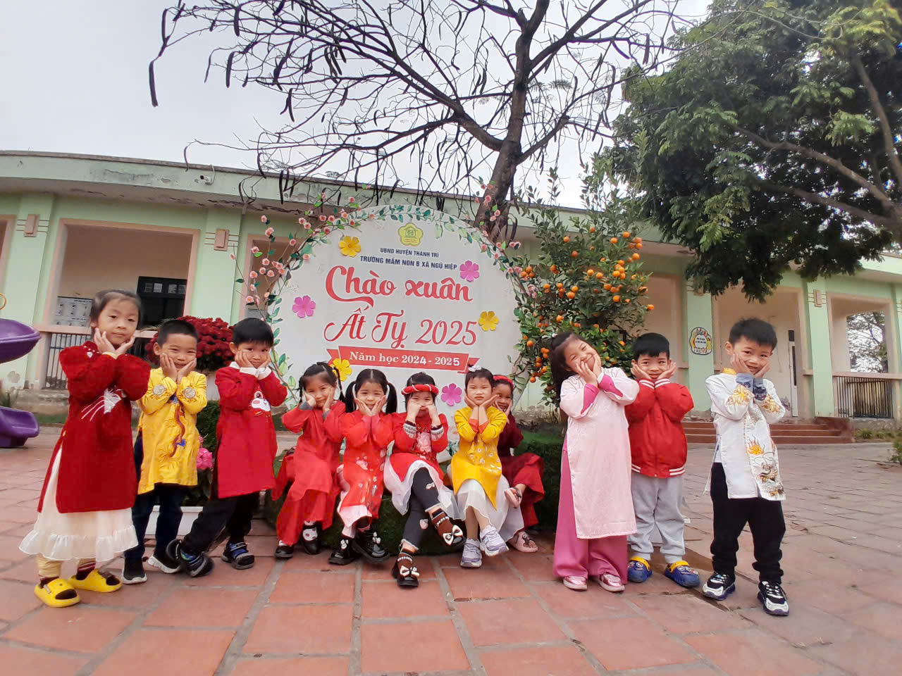 Với các bé mầm non, tết dường như là điều gì đó rất bí ẩn. Tết bắt đầu từ những câu hát “Sắp đến tết rồi, đến trường rất vui, sắp đến tết rồi, về nhà rất vui, mẹ đang may áo mới nhé, ai cũng vui mừng ghê, mùa xuân nay em đã lớn, biết đi thăm ông bà”, tết là những ngày các bé được nghỉ học, tết là lúc các bé được vui chơi, được hòa mình vào không gian rực rở sắc xuân, …Trong tâm hồn ngây thơ trong trẻo của trẻ, tết luôn là niềm hạnh phúc, là niềm vui, là thế giới tinh khôi tràn đầy sức sống… Để tạo không khí ấm áp, rộn rạng cho trẻ, các cô giáo đã trang trí sân trường những cành đào, cành mai rực rỡ, điểm thêm vài giỏ hoa thật nhiều màu sắc cùng những câu đối xuân ý nghĩa…