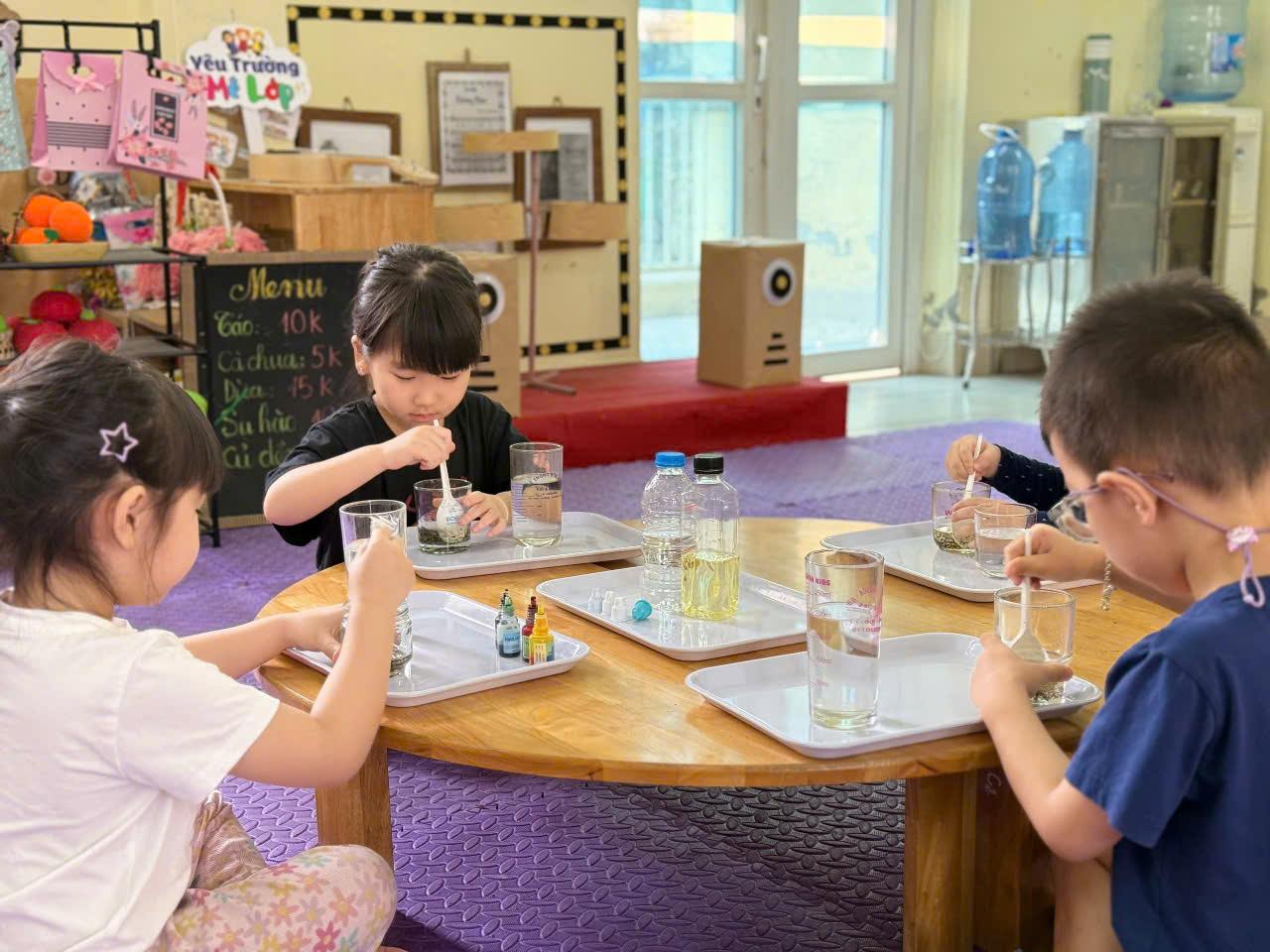 🎉🎉Hôm nay, lớp B2 chúng tớ được cô cho làm thí nghiệm “Cơn mưa sắc màu” siêu thú vị! Cô chuẩn bị ly nước, dầu ăn và mấy lọ màu thực phẩm đẹp ơi là đẹp. 🌻🌻🌻Chúng tớ nhỏ từng giọt màu vào ly dầu, rồi đổ từ từ vào ly nước. Ôi! Những giọt màu bắt đầu rơi xuống, trông y như một cơn mưa cầu vồng đang rơi trong ly vậy! Bạn nào cũng tròn mắt ngạc nhiên, có bạn còn reo lên: “Cô ơi, mưa màu rơi kìa!” Chúng tớ vừa chơi, vừa học được rằng dầu và nước không tan vào nhau đâu, và màu thì nặng hơn nên sẽ rơi xuống. Vui ơi là vui luôn!🌝🌝🌝