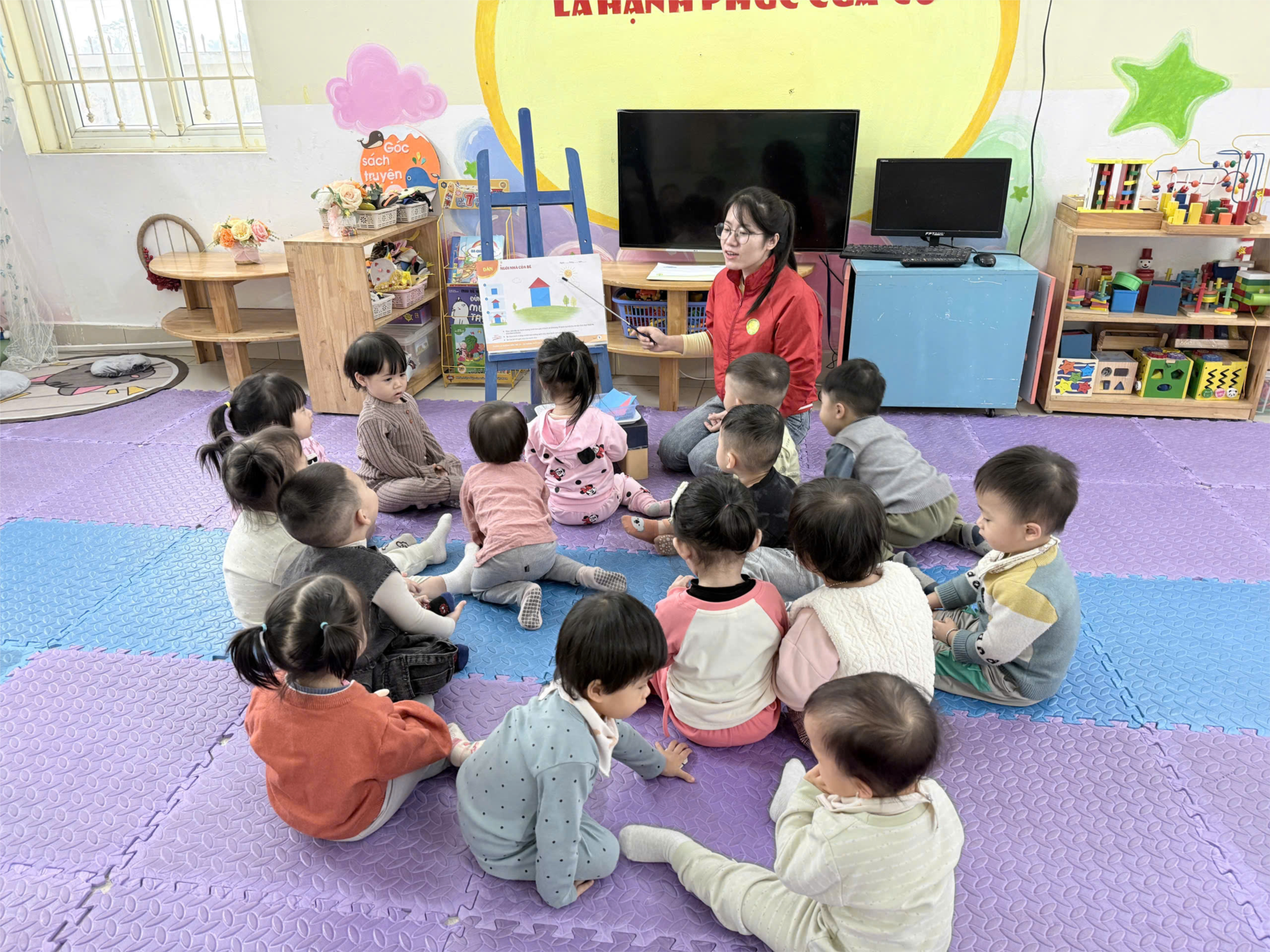 Trong giờ học, cô giáo nhẹ nhàng giới thiệu cho trẻ hình ảnh ngôi nhà với mái nhà và thân nhà đơn giản. Các bé được quan sát, gọi tên và trò chuyện cùng cô: