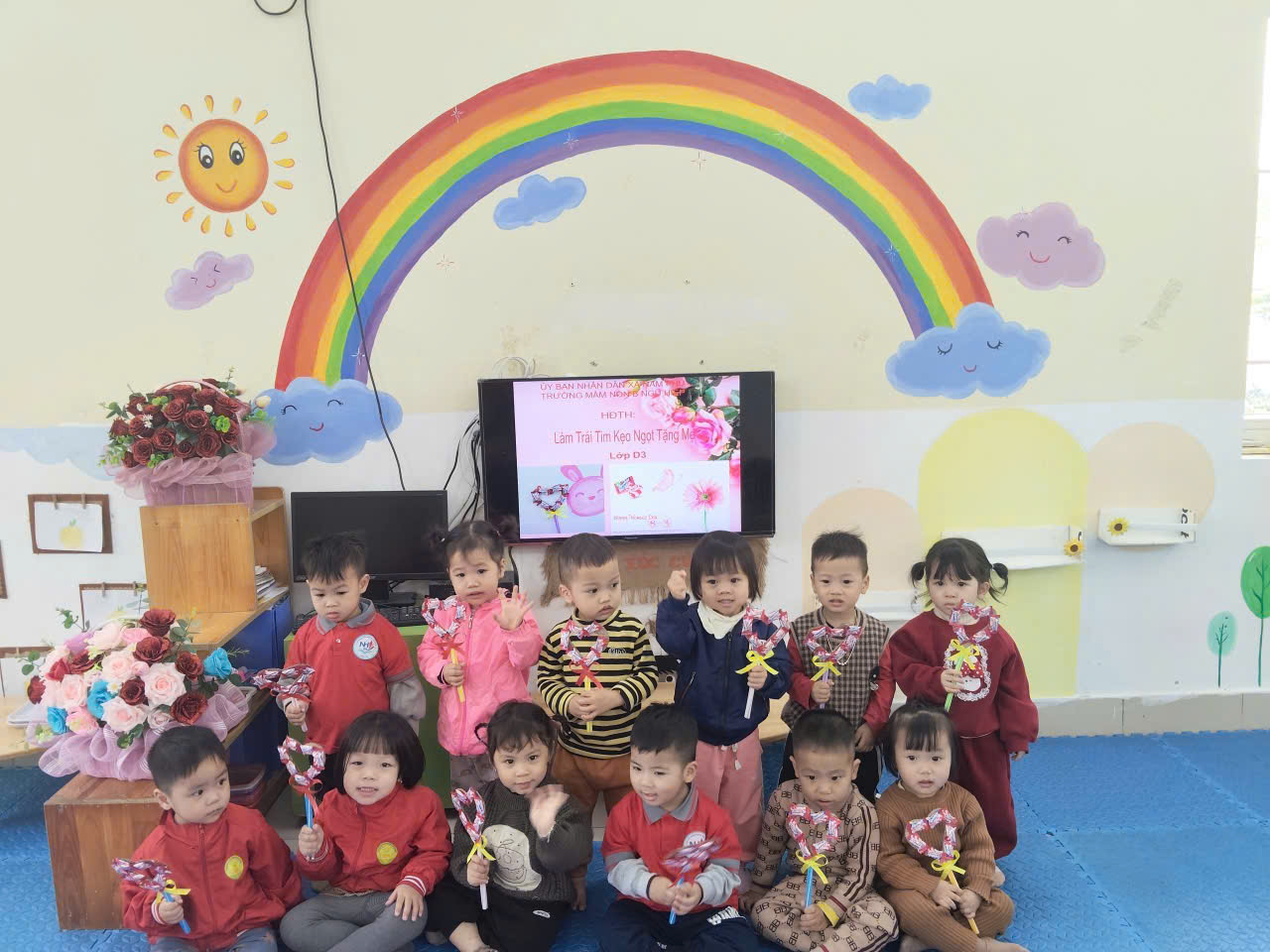 Nhân dịp ngày Quốc tế Phụ nữ 8/3, các bé lớp D3 đã tham gia hoạt động tạo hình vô cùng đáng yêu: làm những chiếc trái tim kẹo xinh xắn để tặng mẹ.
