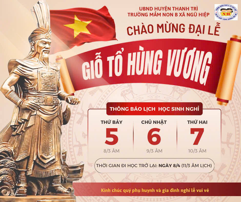 Mầm non B xã Ngũ Hiệp trân trọng thông báo đến Quý phụ huynh, các em học sinh và toàn thể cán bộ, giáo viên, nhân viên về thời gian nghỉ Lễ Giỗ Tổ Hùng Vương 2025 như sau: