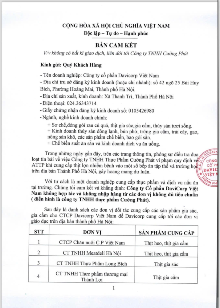 🔎 Nhằm đảm bảo **minh bạch thông tin** và giúp Quý phụ huynh yên tâm, nhà trường xin gửi tới **Bản cam kết của đơn vị cung cấp thực phẩm (Công ty CP Davicorp Việt Nam)** với các nội dung: