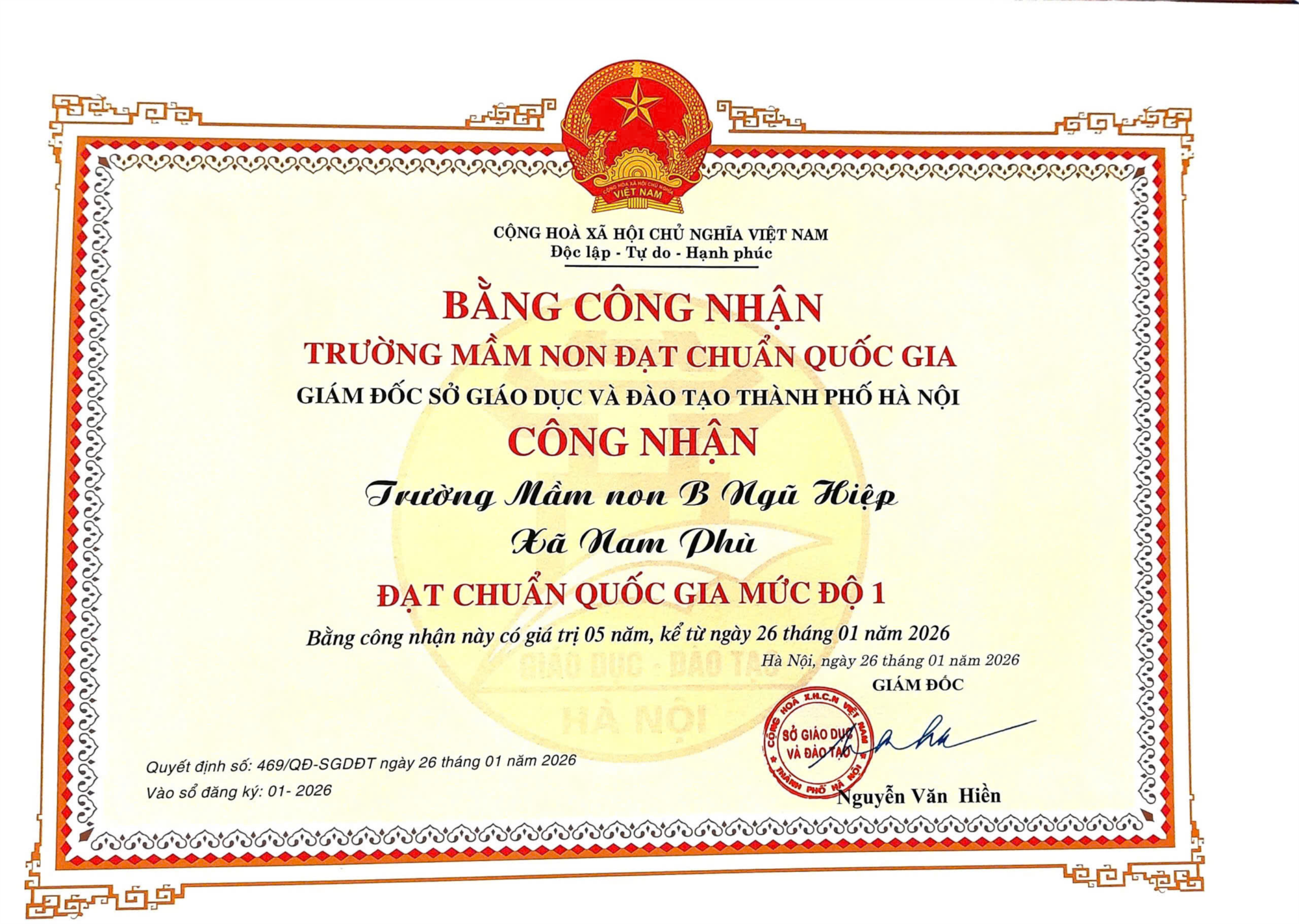 Trường Mầm non B Ngũ Hiệp vinh dự được đón nhận Bằng công nhận Trường Mầm non đạt Chuẩn Quốc gia theo Quyết định số 469/QĐ-SGDĐT ngày 26/01/2026 của Sở Giáo dục và Đào tạo Hà Nội.