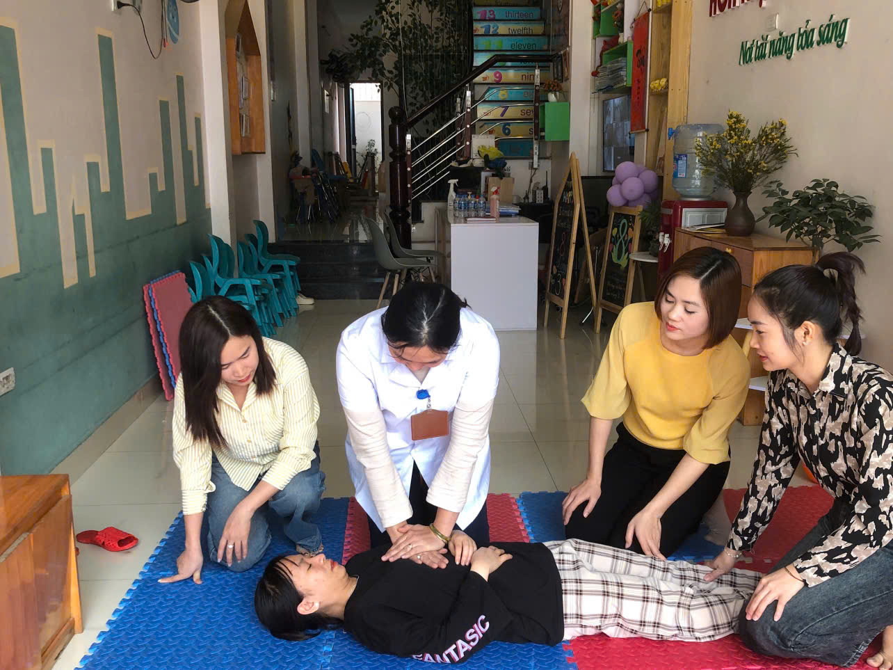 Căn cứ kế hoạch số 05/KH-YTHĐ-MNBNH ngày 22/8/2025 Kế hoạch triển khai công tác phòng, chống tai nạn, thương tích xây dựng cộng đồng an toàn năm học 2024 -2025. Vào ngày 24/3/2025 nhà trường cử đồng chí y tế tổ chức tập huấn cho nhóm lớp Hoa Trạng Nguyên về phòng tránh tai nạn thương tích xây dựng cộng đồng an toàn năm học 2024-2025. Dưới đây là một số hình ảnh đ/c CBYT của nhà trường thực hiện hướng dẫn giáo viên nhóm lớp Hoa Trạng nguyên thực hành các kỹ năng sơ cứu các trường hợp TNTT và vào sổ khám sức khoẻ của trẻ.